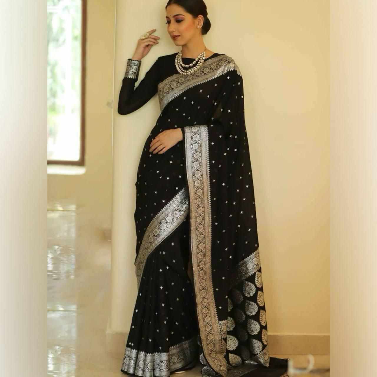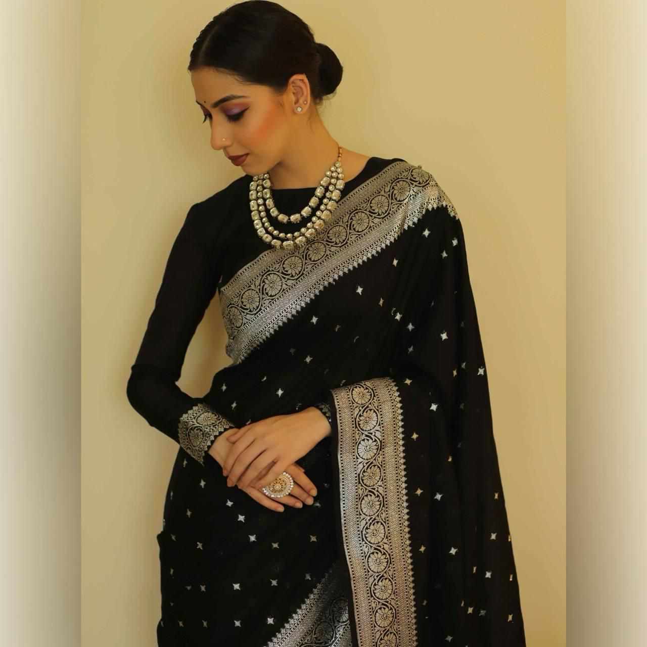 | Name : | MF 1680 BLACK BANARASI SOFT LICHI SILK SAREE |