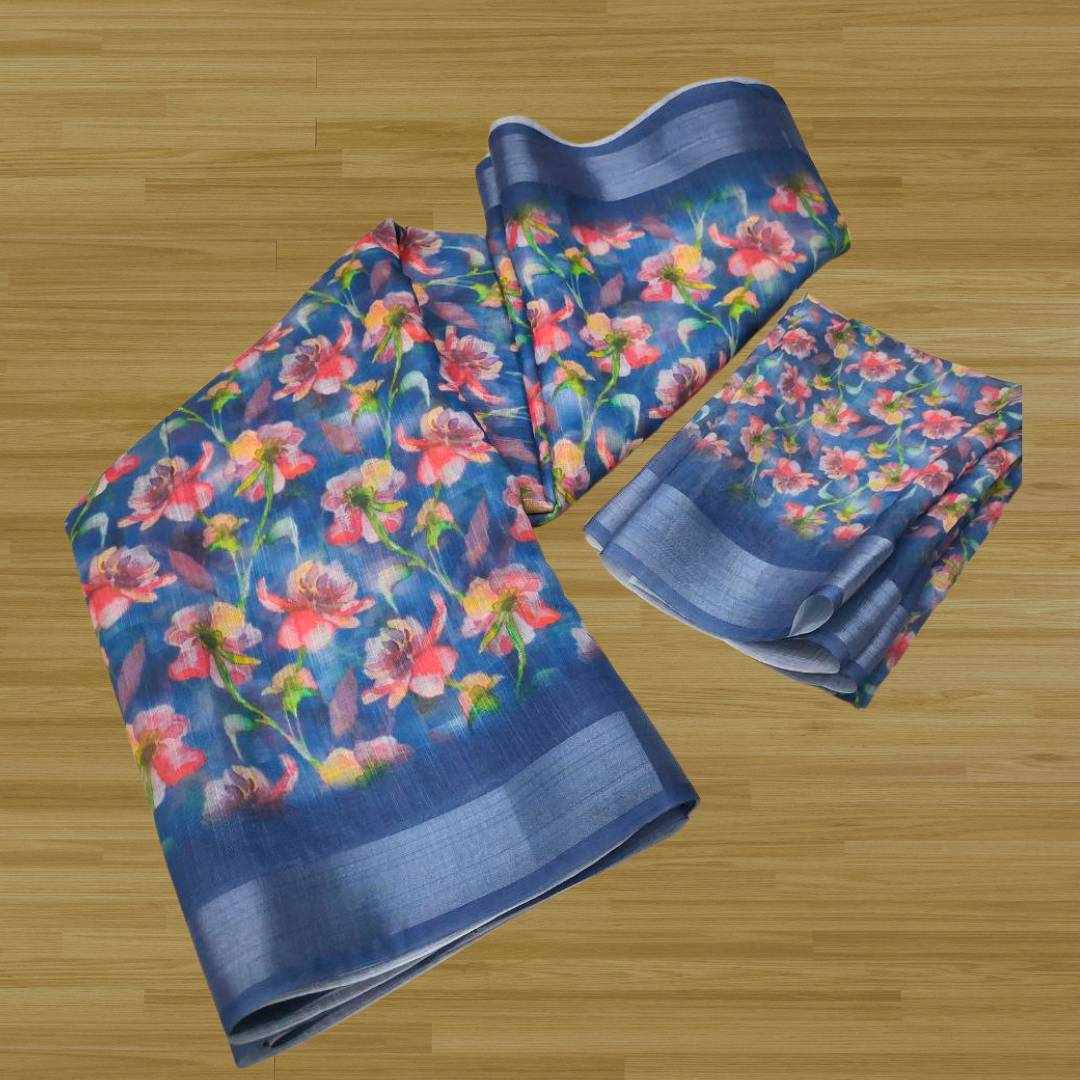 S4S Linen Navy Blue Flower Digital Print Cotton Saree