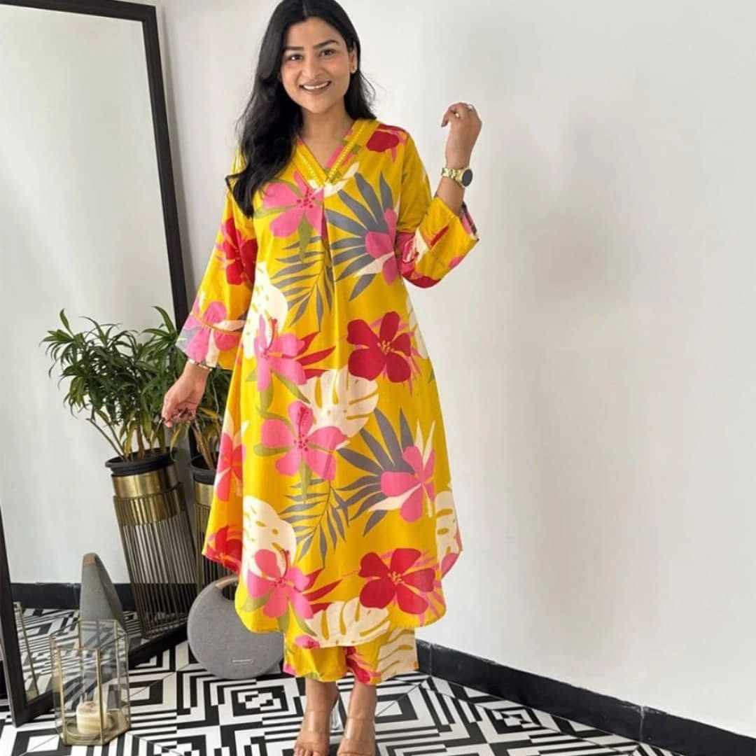 | Name : | SF 2JU Yellow Beautiful Best Cotton Printed Cord Set Dress 717 |